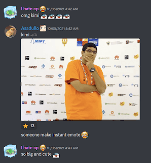 After the contest, timreizin told me that SecondThread talked about me on stream, which was cool. The video at the correct timestamp is here. The idea was that the commentators would tell the audience cool facts about the participants, and I want to talk a bit more about Bhaskar’s cool fact. I know him since 8th grade, and this is Bhaskar’s 4th different field in which he has reached world championship level; previously, he had golds in Junior Science Olympiad, Physics Olympiad, and he was 3rd in the world in U-12 Chess championships… Additionally, he’s quite humble and even Shivam didn’t know this fact until I told him. What a genius!
