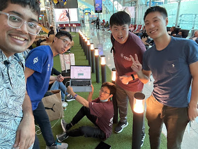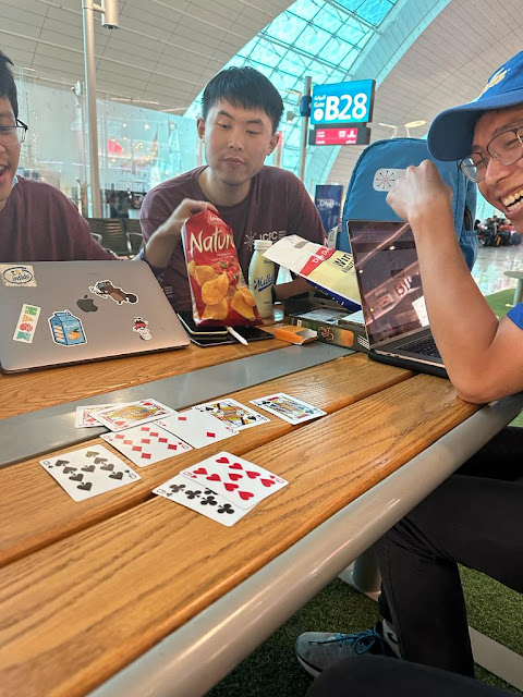 On reaching the airport, we meet none other than… the MIT team (specifically, Mingyang and Jerry from the team, and Ce Jin, their coach)! We briefly wonder how they will get all of their plaques, cup and medals to the US (duh, of course MIT will pay for the extra bag…). It turns out we have the same flight to Dubai; therefore, we end up getting dinner together and then playing card games at the terminal, waiting for our flight. At the Dubai airport, we realize we all have a lot of time to kill; Me, Jerry and Lucas roam around to get some souvenirs for friends back home (I couldn’t get any cool ones at Bangladesh! 😓. I settle on some cool candles I see at the airport. Meanwhile, Mingyang is working on his biology homework for a class at MIT.