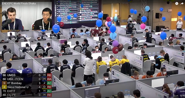 Other results of note are: UCLA is 34th (Lucas’s team did extremely well! They are tied 26th), Purdue comes 20th (tied 16th; Kuroni was extremely sad about missing another problem, but thankfully they would not have medalled even if that were AC due to worse penalty; hopefully that makes the pain lesser), KTH is 13th, barely missing medals 😔. To the surprise of no one, MIT ends up winning; however, they do not AK (all-kill) the set, since they do not get AC on D, a geometry problem.