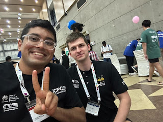 After many scuffed days, Bhaskar was allowed to participate on the day of the contest, and we achieved the best rank IIT Bombay has gotten to date: 33rd tied (our rank with tiebreaks was 37th), solving 6 problems; and we did it in a team of 2! It was a really good feeling, and left us motivated for Dhaka WF. Meanwhile, I also met some of my CP idols, which was amazing!