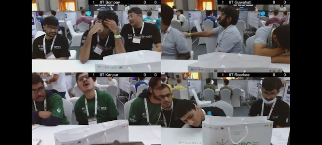 I was too depressed to happily talk to anyone after the contest. Aryan from IIT Kanpur came over and let us know that his team had solved 5 problems (they had 3 before the freeze, and at some point we had AC on 4 problems to their 1 problem); other teams were similarly happy or sad, but everything seemed as if it were in black and white.
